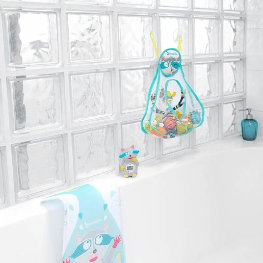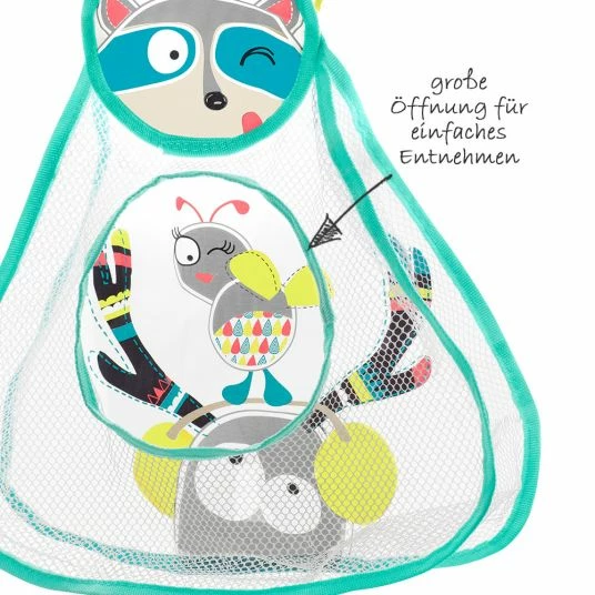 The Storage net mountain animals for bath toys from Badabulle offers plenty of space for spray figures & Co. You simply attach the practical net to a smooth wall or bathtub with two large, stable suction cups. Through the large hole, toys and other bathing utensils can now be quickly stowed away and easily removed. After bathing the wet toys dry in the net. The storage net is decorated with a sΓΌuml;en washable and colorful flowers.