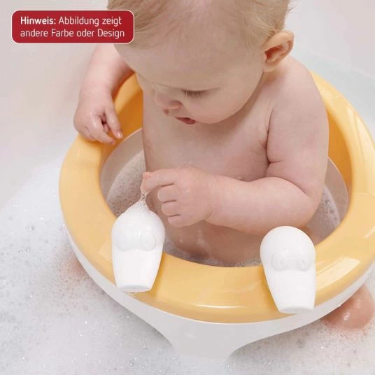Der praktische Badering mit Pumpspielzeug von Bébéjou in Light Grey ist das optimale Hilfsmittel um Deinem Kind den Übergang von der Baby-Badewanne zum normalen Planschvergnügen zu erleichtern. Einfach den Badering mit Hilfe der 4 Saugnäpfe am Boden der Wanne anbringen und es kann losgehen! Die lustigen Wasserpumpen an der Vorderseite, in Form von kleinen Entenköpfen; versprühen Wasser wenn Dein Kleines darauf drückt – so kann Dein Baby fröhlich spielen, während Du es wäschst. Der in grau-weiß gehaltene Badering eignet sich sowohl für Mädchen als auch für Jungen.