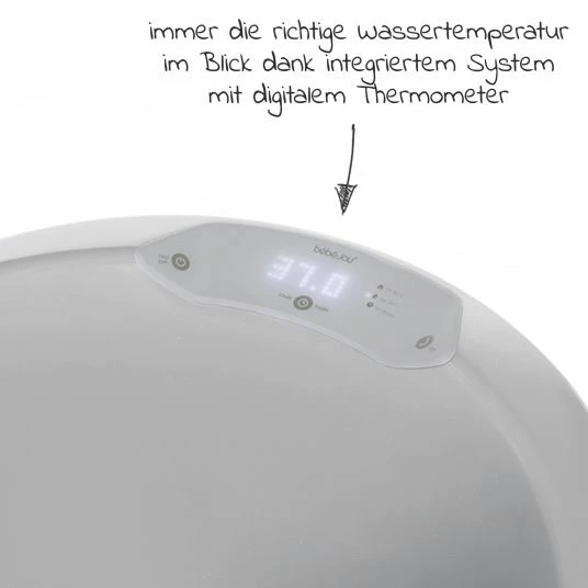 Damit sich Dein kleiner Spatz in der Badewanne rundum wohl fühlt, sollte das Badewasser genau die richtige Temperatur haben. Dank der bébé-jou Baby-Badewanne Sense Edition in Light Grey hast Du sie immer im Blick: Der Badewannenstöpsel ist mit einem praktischen System ausgestattet, dass neben der Raumtemperatur auch die Wassertemperatur misst. So zeigt Dir das integrierte, digitale Thermometer an der Badewanne genau an, wie warm das Wasser ist.