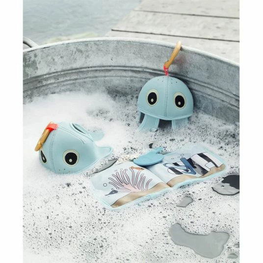 Mit dem Done by Deer Badespielzeug Wally kommt in der Badewanne so schnell keine Langeweile auf. Weicher, kuscheliger Stoff und kleine Details wie die kleinen Flossen laden zum Berühren und Greifen ein. Auf spielerische Weise werden so die Sinne stimuliert. Besonders spannend wird es für Deinen Nachwuchs, wenn Wally untergetaucht ist und danach auf den Kopf gedreht wird: Durch kleine Löcher tropft nun das Wasser aus dem Neopren-Köpfchen und animiert zu weiteren Tauchgängen.