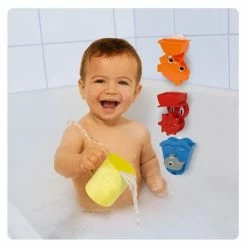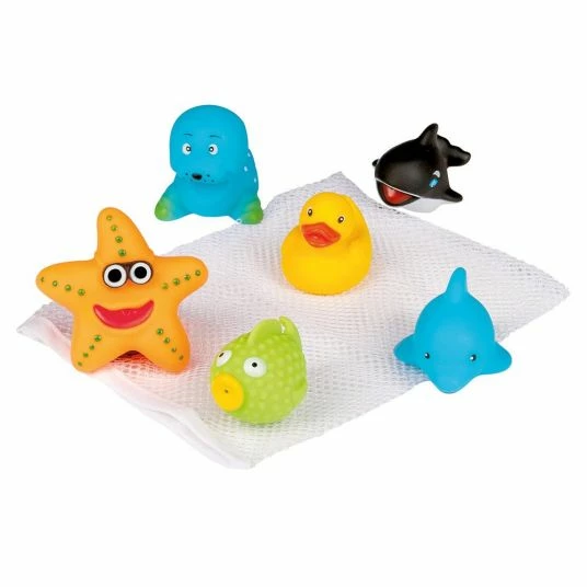 Mit den Kleinen Badefreunden von Happy People geht Ihr Kleines gerne in die Wanne! Kugelfisch, Wal, Seestern, Ente, Delfin und Seerobbe leisten Ihrem Schatz beim Baden beste Gesellschaft – egal ob in der Wanne oder im Planschbecken. Die bunten Farben und verschiedenen Formen regen Ihr Kind zum Greifen an und fördern seine sinnliche Wahrnehmung. Die weichen Spritztiere sind innen hohl und können so leicht durch Drücken mit Wasser befüllt werden. Danach heißt es dann Wasser marsch! Nach dem Spielen lassen sich die Tiere im mitgelieferten Zugbeutel praktisch aufbewahren.