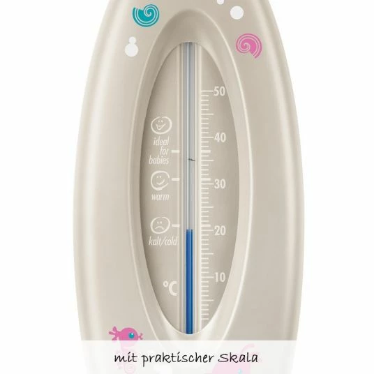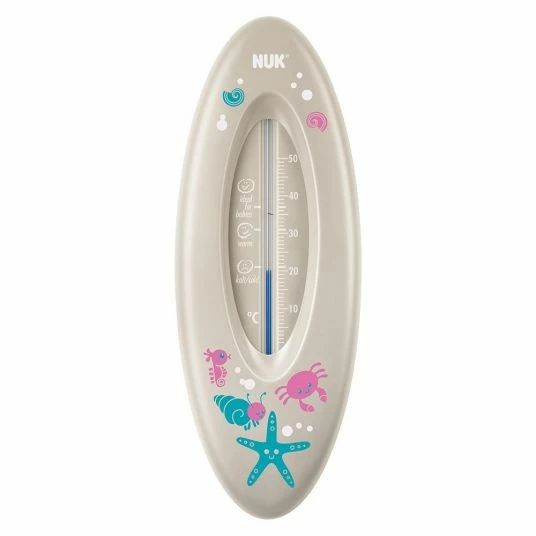 The Ocean bath thermometer in grey from NUK is a great helper in preparing baby’s bath. The measuring liquid consists of natural rapeseed oil and the thermometer is clearly scaled up to 50Β° C. The thermometer can be adjusted to any temperature. This guarantees optimum measuring accuracy. The practical scale uses smileys to indicate whether your child feels comfortable in the bath water and whether the optimum temperature of 37Β° C is being maintained. The Ocean bath thermometer is stable, break-proof and decorated with funny sea motifs.