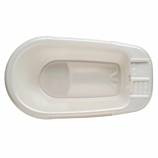 Die komfortable Badewanne Bella Bambina in Perlweiß Creme von Rotho Babydesign verfügt über zwei Ablagen für Seife und Co., sowie eine integrierte Sitzmulde für besseren Halt. Mithilfe des Ablaufstöpsels kannst Du nach dem Baden das Wasser bequem ablaufen lassen.