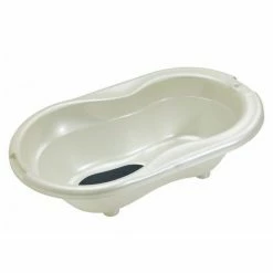 In the pearl white cream coloured bathtub from the top series by Rotho Babydesign, bathing is especially fun for the little ones. You can lean comfortably against the edge of the tub. One side is great for babies. The other side meets the needs of small children. The anti-slip coating on the baby side provides a secure hold. On the infant side, the sitting position secures a small hollow.
