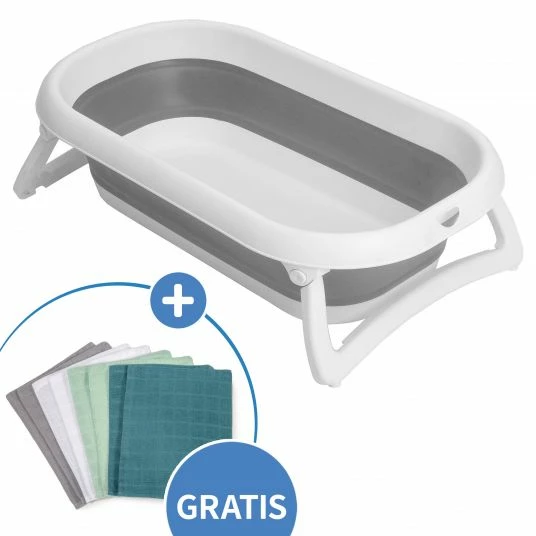 - praktisches Set mit faltbarer Badewanne & 8 kuschelig weichen Mull-Waschhandschuhen