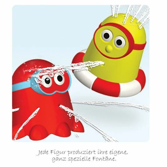 The colourful boats and cheerful figures can be stacked on top of each other and combined according to your mood – there is no right and no wrong. The water flows through every single element and sprays; sprays or gurgles as a magical cascade from the top. The top figure can be changed, so that new fascinating effects can be achieved again and again. Because that is the special highlight: Each figure produces its own, very special fountain. The red boat spins as it splashes water, the blue boat has a pivoting propeller, the octopus figure sprays in all directions, and the lifeguard splashes water out of his mouth and thin “hair fountains” at the same time.